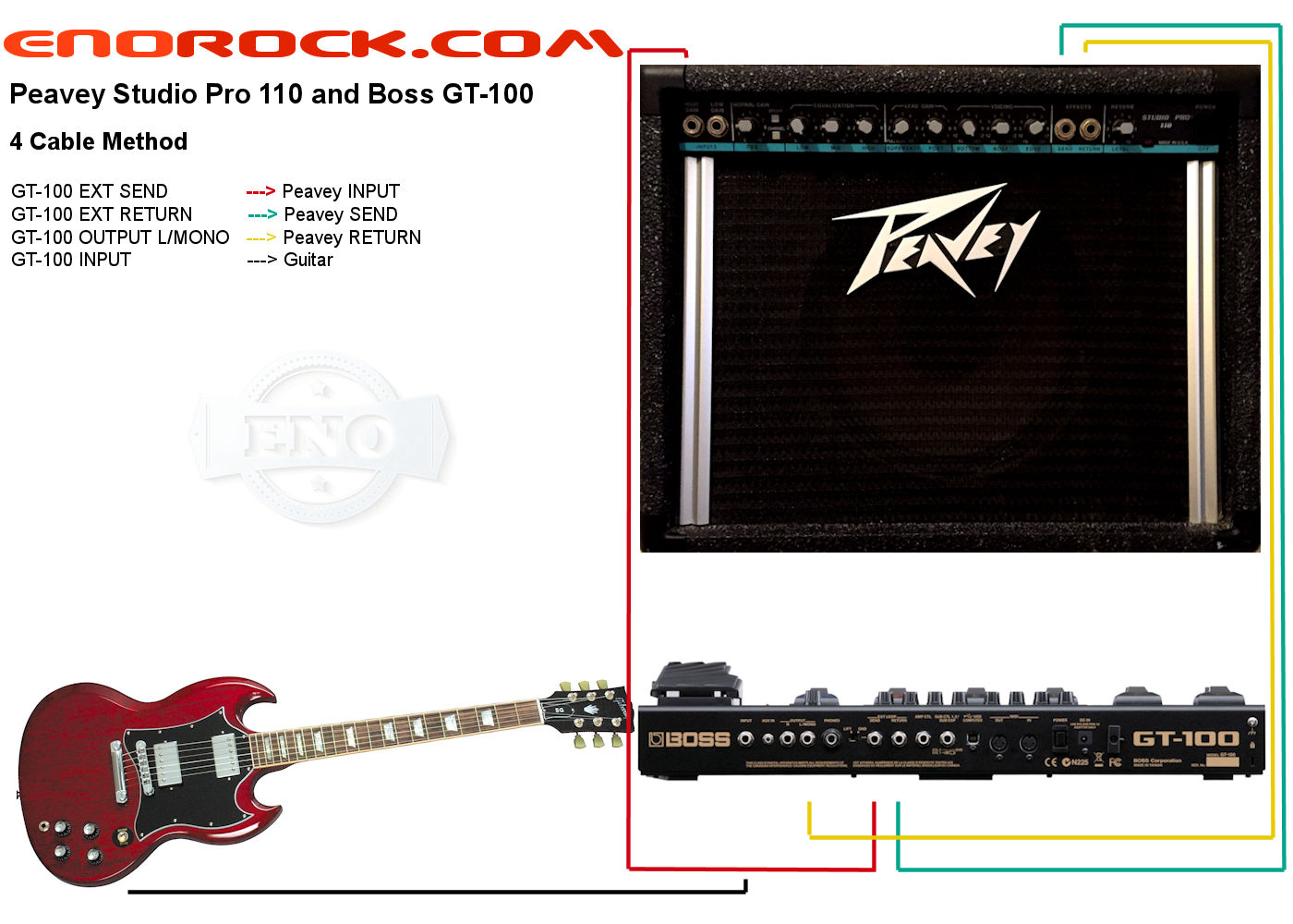 This diagram will show you how to connect Boss GT-100 and Peavey Studio Pro 110 amp using Four Cable Method.