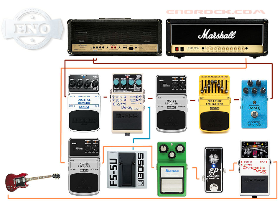 Back: MXR Analog Chorus --> EQ700 --> NR300 --> Boss DD7 --> DR600
